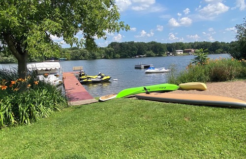 This 2 bedroom, one bath cabin is on the shores of crystal clear Beaver Dam lake in Cumberland Wisconsin. It offers great swimming and swimming dock, 2 kayaks and a paddle boat for use by guests. It is also conveniently located near a boat landing and provides a dock for your power boat. The cabin is in the town of Cumberland for easy walking to the stores, bars and restaurants in town. The cabin is on the 300 acre plus Norwegian Bay side of Beaver Dam and the main 1100 acre lake can be accessed through a channel. The cabin sleeps 5 to 6 with a queen bed in the master bedroom, a bunk bed with a lower full bed in the second bedroom and a top twin. (An extra mattress is available). A pull out full futon bed is on the east facing sun porch for extra sleeping room, and sunrise views. Large one acre yard offers space for yard games, a rock fire pit and room for tents and privacy. Enjoy the Wisconsin cabin experience only 90 miles from the Minneapolis St. Paul metro area!