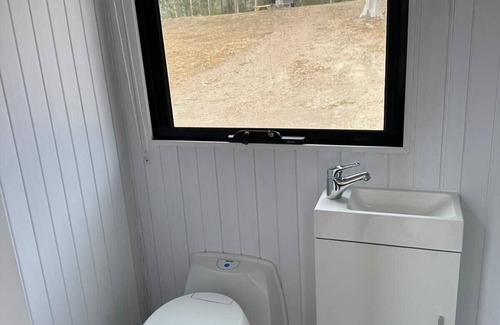 It's a cozy 139-square-foot tiny home set in a private shady spot 500 metres away from the main house, with easy access to water, a kitchenette with cooking equipment, and excellent bathroom facilities. The bathroom follows ecologically sustainable principles, including an eco-friendly cassette toilet with a removable waste holding tank, hand basin, and shower (gas heated for hot showers).
