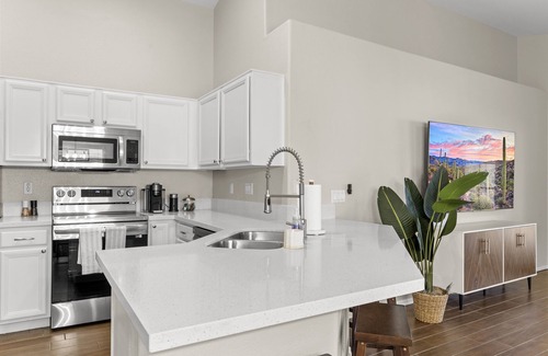 The Sandlot on Ross has a gorgeous full kitchen remodel boasting all new 2023 LG appliances as well as stunning quartz counters with plenty of bar space. Enjoy a premium coffee experience with our Nespresso Virtuoline machine and kitchen loaded with all the essentials.