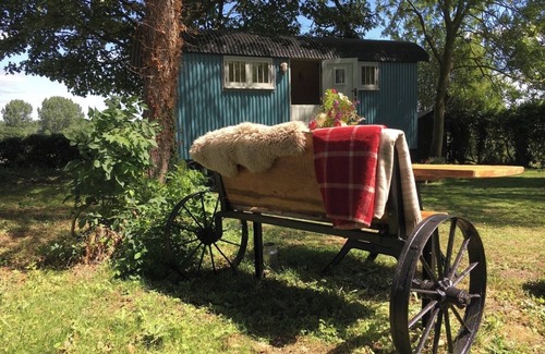 Romantic, luxurious hideaway for two, ensuite shower, wood burner, set in a secluded orchard on a farm in Suffolk, within walking distance to two village pubs. Half hour drive to the Heritage Coast. The Scrumpy Shepherd sits in a private orchard, in an elevated position, enjoying views over the valley.