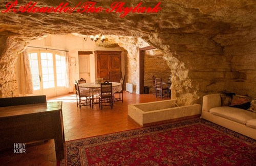 This is the Skylark, our 'Troglogite' (a troglodyte gîte - a guest home in a cave!). It is a majestic space, with multiple windows and doors along the cliffside, giving onto the courtyard. The main entrance opens up to a grand living space with several alcoves, where we have dining, office, den and two single beds that give you an extra sleeping area. There is an interior connection to the kitchen and bedroom, both rooms also open up to the courtyard.