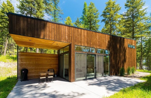 Stoner Creek Cabins offers clean lines, modern efficiency, and thoughtful amenities. Our contemporary design is completed with Shou Sugi Ban siding, a sustainable preservation technique originating in Japan. The cabin may accommodate up to four people with one queen bed in the bedroom and a sofa sleeper in the living space. The open concept kitchen and living area includes floor to ceiling windows with sliding doors that may be opened to experience the woods from the comfort of your couch. The cabin includes everything that you should need to feel at home! The kitchen provides a full-size refrigerator, microwave, oven, dishwasher, and Nespresso coffee machine with all cooking and eating implements. The stacked front-loading washer and dryer includes complimentary laundry pods. Enjoy the outdoor space with a large deck, table and chairs, propane grill, lounge chairs and private fire pit.