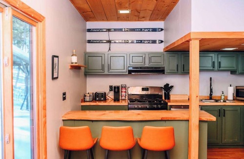 After parking, you'll walk the wooden steps to our front door, which can conveniently be opened with a code provided prior to arrival. Before ascending, you can set up your skis on the rack at the bottom of the stairs. When you enter the home, you'll immediately see our kitchen, which contains the essentials (pans, utensils, plates, glasses, etc) and appliances (stove with gas range, oven, microwave, toaster) for cooking a meal at home following a day on the slopes, as well as a Keurig hot and iced coffee brewer.