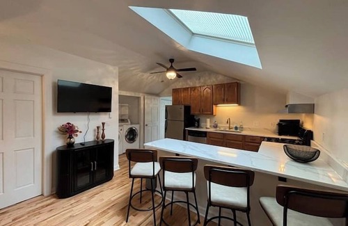 The third floor features yet another full kitchen and comfy open concept living room/hangout space with access to the inside of the iconic tower, plus two more bedrooms with queen beds and renovated bathroom with luxury walk in tile shower.