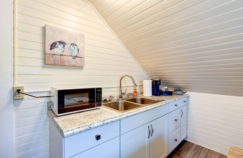 Unit 7 - “The Tree House Room” is on the 3rd level (top floor) and is approx. 350 sq ft with 1 bed/1 bath. This space has 1 mid-size bedroom with a queen-size bed, small dining table, 39” TV, a bathroom with a stand-up shower, and a full kitchen for your use and enjoyment. The space is up high and closest to the canopy of the very old pine tree in the back giving you the feel of being up high in a tree house.