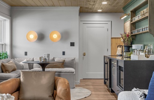 The space features boutique-style bedrooms (1 king, 1 queen, plus a queen sleeper sofa), a cozy living room with TV and couches, a fully equipped kitchen with breakfast island. Enjoy high-speed WIFI, keyless entry, and convenient on-site parking.