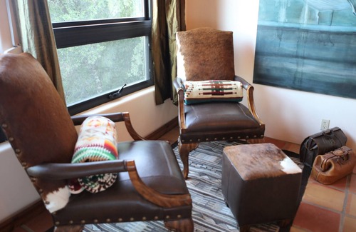 The spacious Anejo or Bridal Suite offers breathtaking views from its wall of windows. It features a sitting area with comfy leather chairs that is defined by a Zapotec textile from Teotitlan and an original work by renowned San Francisco artist Jessica Niello. From the silk window coverings to the entablature mirror, no expense has been spared in this exquisite suite. The suite has a private spa bathroom with jetted tub, bidet, and double-shower.