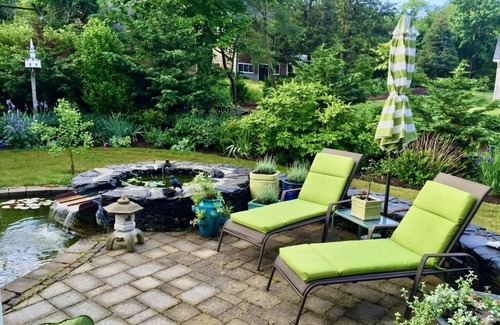 Outdoors: Landscaped grounds are surrounded by mature shade trees, stone walls, perennial gardens and fruiting blueberry bushes (pick your fill in July and early August). The backyard is fenced and private. From the sunroom, step outdoors to the covered stone patio and dramatic koi pond with waterfall. The pond abuts the patio and is covered with a net for safety, however small children should be supervised. The patio has lounge chairs and all-weather wicker dining set that seats four. Weber gas grill. Carriage House has an additional patio with Weber grille and dining table that seats 4.