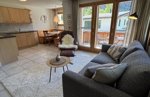 The apartment features a spacious living and dining area with a comfortable sofa corner, dining table and fully equipped kitchen. A separate bedroom with a double bed and a sofa bed in the living room provide space for up to three people. The bathroom is equipped with a bathtub with shower function. A shared storage room is available for sports equipment. A balcony with a view completes the offer.