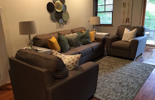 The living/dining/kitchen is appointed perfectly for you and your friends to gather during your stay. The modern kitchen is finished with stainless steel appliances and equipped with everything you need to prepare a meal. Light the fireplace and gather around the dining room table that easily fits 8-10 people. There is also a large TV located in the living room area. Cable and WIFI are provided for your convenience.
