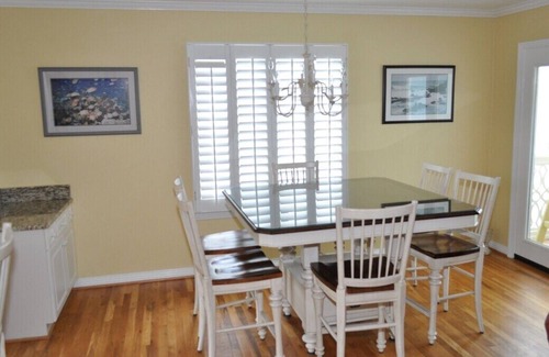 Bright & beachy 3 Story Open Floor Plan, all Hardwood floors, 3rd floor Master Bedroom has a King size Bed, 1 Large Closet, Ceiling Fan, TV, Bose Surround Sound & Yamaha Stereo, Private Master Bath with Large 2 Adult Jetted Tub, & Shower. Private Covered Porch. Additional 3rd floor bedroom with King Bed, Ceiling Fan, Large Closet. Additional bedroom has a two Twin Beds, Ceiling Fan, TV & Closet. Spacious Hall Bath with Tub/Shower. 1st Floor Master Bedroom has a King Bed with private Bathroom shower, Large Closet, French doors leading to a Large Deck outside with outside shower, picnic table, and grill! Spacious Great room with Leather furniture, Gourmet Kitchen with Granite countertops, all New Stainless Steel Kitchen-aid Appliances. Dining Room for 6 & Breakfast Bar for two. Dining Room leads to porch