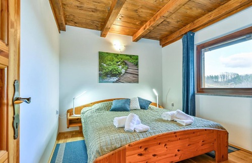 A rustic vacation home built of wood and stone is equipped with everything you would need for your carefree vacation. The two floors are connected by a spiral staircase, the upper floor is a sleeping loft, and on the first floor you will find the second bedroom and bathroom separated from the kitchen, dining room and living room. The same is located in a quiet environment with plenty of greenery and fresh air to make your vacation even more beautiful and relaxing. Moreover, this accommodation offers you a lot of space to spread out and spend nice hours with your loved ones. In the outdoor area you will find a barbecue for warm summer evenings, a private outdoor pool for hot summer days, playgrounds with, among other things, seesaw and swings for the young guests and a badminton net as well as a volleyball net for the more active vacationers. They are located quite close to the forest and also have a wonderful view of the surrounding countryside.