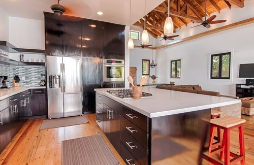 The chef's kitchen is large with white stone counter tops and dark Honduran wood cabinets. The LG gas cooktop is on a substantial island with seating for six. All appliances are top of the line LG. The double door refrigerator has UV filtered water and an ice maker. The kitchen has been meticulously outfitted with high quality knives, cookware, dishes, silverware, etc.