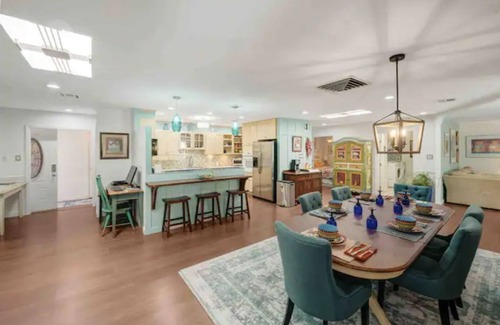 Imagine your family or business group (up to 26) at this spacious, secure gated compound. Three adjacent houses combine bright, comfortable 10 BRs and 6.5 baths with enchanting NM style and high-tech convenience. Smart TVs in all bedrooms and strong WIFI. Enjoy 2 colorful well-equipped kitchens, 2 adjacent dining areas/ 2 living rooms and two patios. Nest thermostat, Central heating /cooling. Plentiful free parking for multiple vehicles. Easy access to all major city freeways, airport, and the best of Albuquerque.