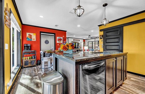 The well-stocked kitchen has plenty of counter space including a center island with extra seating. The dining room table can accommodate 6 people and the kitchen bar area has two padded stools. Adjacent to the dining room you will find a coffee station and a very functional laundry room with large capacity washer/dryer, unscented Tide pods and Bounce dryer sheets for your use.