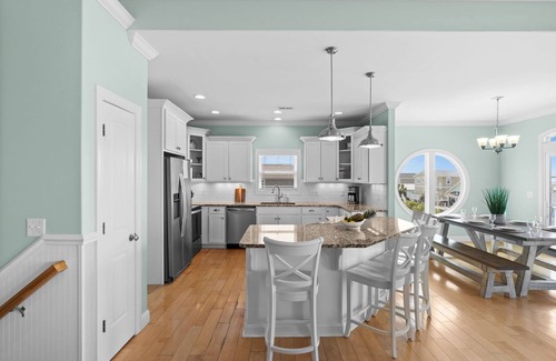 The kitchen, located on the top floor, is open and airy with stainless appliances, granite counter tops, and a center island with bar stool seating for 4. The kitchen is nicely appointed with everything you need to create meals at the house, including multiple slow cookers. The dining room has a large open window to take in the views and the farmhouse table has bench seating on both sides (easily accommodates 8-10 people).