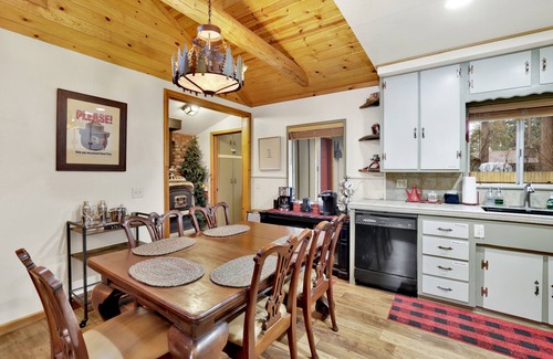 Revel in the ambiance created by the wood beamed vaulted ceilings pairing with beautiful hardwood floors and modern comforts throughout, you will truly feel right at home at this tree house from the moment you enter. Snuggle up together on the couch and watch the snow falling from the massive picture windows or pop on a movie on the flat screen Streaming TV for a movie night at the cabin. The open space floor plan leads seamlessly to the dining area with a decorative vintage wood stove and the equipped chef's kitchen complete with all that you need to prepare home cooked meals here at the cabin including freshly painted cabinets, cookware, utensils, general appliances, and a dishwasher to ensure a breezy cleanup afterwards.