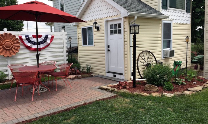 Our recently renovated 150 sq. foot Tiny House has a brick patio & private entrance in a separate building. Built in 1891, the Summer Kitchen features the original exposed beams and chimney. The loft bedroom has a 5' window overlooking the gardens with a view of Leaser Lake in the distance.