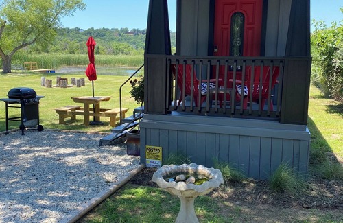 Enjoy your stay in this fully equipped tiny house cabin on the lake, with the Brazos River across the street. A wonderful tiny house featured on the DIY Network’s: “Texas Flip N Move.” Go fishing in the lake from the backyard dock, or launch a boat into the river at the boat ramp up the street. Roast marshmallows around the fire pit, cook burgers on the gas grill, have a picnic at your outdoor picnic table. Later, enjoy a glass of wine at sunset on the covered porch or on the shaded bench by the dock. Located just 9.5 miles from the beautiful Granbury town square.
