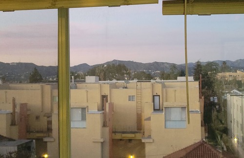 Spacious one bedroom rental on the top floor. It's a corner apartment with a close clear view of the Hollywood hills including the Hollywood sign and observatory. 30 min. drive to sofi stadium 3 miles from Hollywood and located walking distance from public transportation. The walls are filled with local LA artist canvases. Elevator and laundry room.
