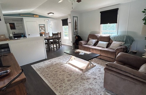 With a comfortable king size bed in one room and double twin adjustable beds in the other, you’re sure to get a great nights sleep after stargazing on the deck or by the fire pit! Fully stocked kitchen for making yummy dinners, washer and dryer with soap is included.The living room has a sofa with 2 recliners and also a stand alone recliner!