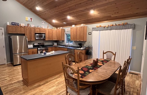 Home is in a quiet Lake neighborhood on a large lot with thick woods surrounding the property. Please respect neighbors. There is a bonfire pit in the backyard to use but be aware there are burn bans that occur when it is dry. There is three bedrooms, one main bathroom / laundry room, and master bathroom on main level, basement has two bedrooms, one full bathroom and extra bed in open area