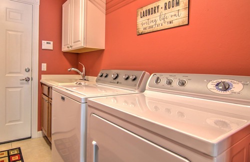 The main feature of the outside of the home is the lanai. There is a nice covered area with a outside al fresco dining set to enjoy your evening cocktails or morning cup of coffee on. You can jump right in to the heated pool and there is a big privacy wall on the side so you have nice seclusion from the neighboring villa. You can use the attached 2 car garage to park in along with the driveway. We can't wait to welcome you to our home!