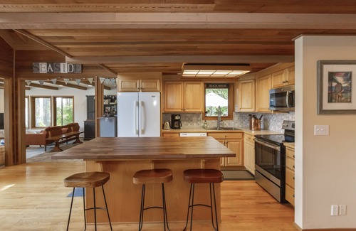 Main Floor ~ The main floor has a large entry, which opens to a beautiful living room featuring three walls of windows capturing the stunning water view. Living room has plenty of comfortable seating for your group. The dining area not only has amazing views, but a large dining table seating 8 comfortably. The kitchen is off the dining and living area and has a nice sized island with 3 stools. Included are plenty of dishes, serving ware and cooking supplies for all the feasts you can cook up. Of course, there is a propane BBQ outside on the patio as well. Laundry room, powder room, and access to the wrap around deck are also on the main floor.
