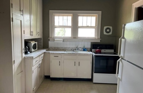 This 1920's two flat across the street from the Rock River is just minutes from downtown Dixon, the bike trail, Nachusa Grasslands, White Pines, Castle Rock and Franklin Creek State Park! The second story unit has it's own entrance and offers spectacular river/tree top views. The unit includes a kitchen, bathroom, dining room, bedroom, sunroom, den, along with a yoga/workout room with roll out futon and bedding . Long Term rentals of more than 5 days are limited to 1 person. The space has lots of windows and natural light along with an open floor plan. Den has a roku smart TV and high speed wi-fi . There is a separate washer and dryer in basement for the upstairs unit. Guests can sit out on side patio. Grill available.