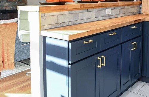 You'll love this thoughtfully designed second-floor apartment with clean lines and cozy details. It features 2 bedrooms—1 with a king bed, 1 with a queen—each with wall-mounted smart TVs. The bathroom has a spa-like feel with a walk-in shower and modern fixtures. The open living room separated by stool lined knee-bar flows into a farmhouse-style kitchen with open shelves, & butcher block counters. Enjoy a custom fireplace mantle with an electric insert sitting below a ceiling-mounted TV.