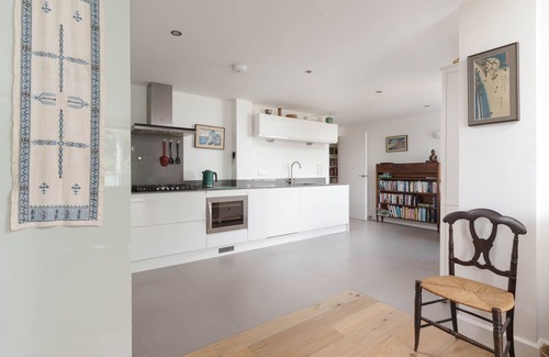 Open-plan to the kitchen/dining area, the light living area is a comfortable space filled with eclectic pieces reflecting the owner Meg’s family’s history after a long residence in the far east . There is a dark blue velvety sofa to sink into for nights with a good film, or simply to put your feet up and indulge in one the owner’s many books. A second sofa makes for a sociable space and to relax. A large TV with Sky Essentials package will provide plenty of entertainment during your stay. Off the living area is access to a small balcony.