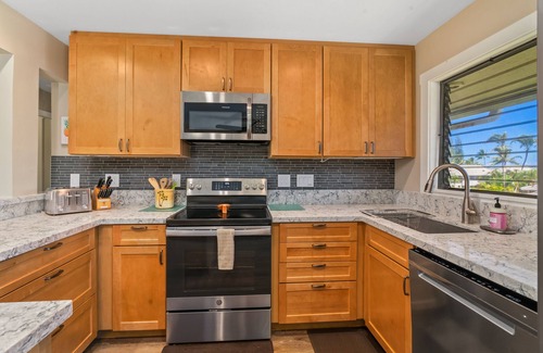 This vacation condo comes well equipped for a worry-free vacation; from a full kitchen stocked with all the chef's essentials (cookware, cooking oil, spices, salt & pepper, sugar...) to the bountiful vacation gear of beach chairs, beach umbrella, towels, cooler, boogie boards, snorkel gear, and a convenient beach wagon to help carry it all to your destination of choice here in paradise. We've got you covered!