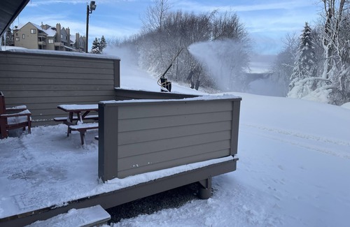 True Ski-in and Ski-out from your private rear deck on the Village Trail Slope. A remote-controlled gas-log fireplace will keep you warm and toasty as you look out over the Village Trail. Yes, The Winter Sonata Condominium, where the ski slope is in your backyard. Spend more time on the slopes rather than getting to the slopes. Ski-in from the Village Trail Slope onto the private rear deck of the condominium and ski-out from the same private rear deck of the condominium onto the Village Trail Slope and a 3 minute walk to Boomerang Trail. For winter stays from Dec 22, 2025 till March 15, 2026 there is the complementary use of a gas log fireplace with remote that also has a second protective standalone fire screen for safety. No walking around a huge building to get to the slope and no traversing huge open spaces to get to the ski-trail. (DISCLAIMER: Ski-in Ski-out is Weather Permitting i.e. if the weather is warm and there is no snow or insufficient snow on the Village Trail, then there is neither ski-in nor ski-out). Also the hot tub and pool are available from Memorial Day till Labor Day at the recreation center about 150 yards from the front door at no charge. During the balance of the year, hot tubs and an indoor pool is available at the lodge for a fee.