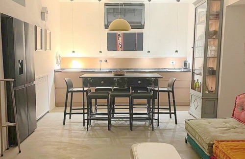 The living room is paved with resin. The furnishings are modern and welcoming, and include a sofa. In the living room you will also find a cooking area. The kitchenette is equipped with a four-burner induction cooker, an electric oven, an American-style refrigerator with ice-maker, a dishwasher, an Italian-style coffee-maker and an American-style coffee-maker. There is also a washing machine (hidden in a utility room), an iron and an ironing board. The dining table can accommodate eight guests. In this room you will find a television (local channels). From the living room you will be able to enter the patio through a French door. The room has a high window, as well as a roof window.