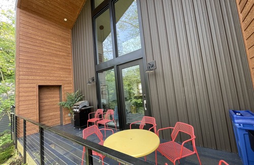 This brand newly built cottage features a fully equipped kitchen and cozy living space with vaulted open ceilings, 1 1/2 bath, a lofted master bedroom with lots of natural light and small 2nd bedroom with trundle bed. It includes a washer and dryer, deck furniture and grill, fire pit by the river, and 2 street parking spots.