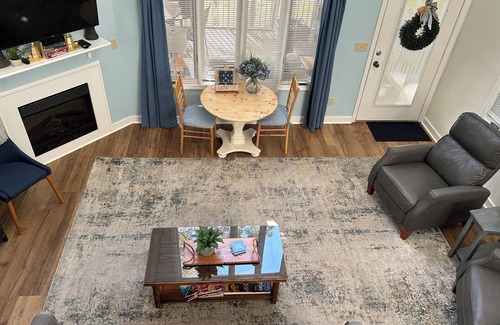 This beautifully updated lakefront unit offers two bedrooms and two bathrooms, along with a fully stocked kitchen, new floors, countertops, furniture, and a spacious screened-in porch that serves as a second living area with comfortable seating and dining options. From the porch, you’ll enjoy treehouse-like views of the lake and surrounding landscape, while the inviting main living area features two recliners, a new couch, a dining/game table, an electric fireplace, and a cabinet filled with books, puzzles, and games. The loft bedroom includes a king bed, private bathroom, cozy reading corner, and a desk with second-story lake views, while the downstairs bedroom has two full-size beds, smart bedside lamps with USB ports, and direct access to the bathroom and washer/dryer. Both bedrooms and the living room are equipped with Smart TVs (please note: no pullout sofa). The cheerful kitchen has been refreshed with new countertops, refrigerator, sink, and painted cabinets, making it a bright space to cook, pour a glass of wine, or start the day with coffee. Conveniently close to an outdoor pool, boat rentals, and more, this no-smoking, no-pets unit provides everything you need to relax and enjoy your stay, though guests with allergies should note that while the property is thoroughly cleaned, the owner is a pet owner and the unit may not be completely free of allergens or dander.