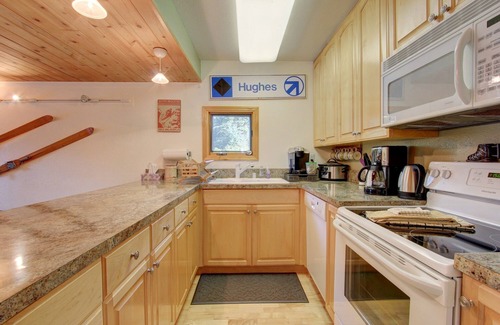 This two bedroom condo will accommodate up to 5 people very comfortably. A king size bed in the master bedroom and a bunk bed with a twin and a full bed in the second bedroom. This condo is bright with vintage ski furnishings, fully furnished kitchen with counter seating, and a 42” plasma TV with DVD and cable. There is also coin operated laundry available in the building.