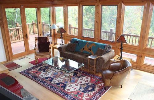 The house has full windows on three sides facing the River (no curtains necessary as no neighbors) and you can view the River from everywhere! Also, across from the River is the amazing Round Mountain. So you are surrounded by mountains while you view the Little Buffalo right below. Perfect for kayaking, canoeing, of lounging on tubes in the cool river stream.