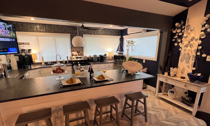 Take it easy at this unique and tranquil getaway. This is a cozy little pool house with ALL the amenities; full kitchen with an ice machine, very comfortable hide away queen-sized bed, full bath, Wi-Fi, indoor and outdoor TV’s, large fully covered outdoor patio, and a 4 1/2 foot deep pool with a tanning shelf. The pool house is in the backyard of the main house on a large, gated property, but the back patio faces away from the house and is very private and serine. Frozen drink machine available.