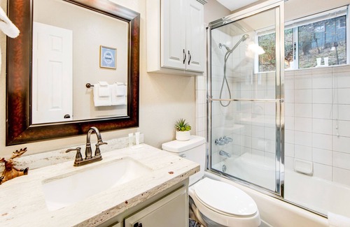 This open and very inviting vacation rental features a well-equipped, full kitchen to help with meal prep, indoor and outdoor dining tables, and a sunken living area set beneath a soaring ceiling and complete with a wood-burning fireplace, a large sectional, and a TV for streaming all your favorite channels. You'll also find a quiet space at the top of the stairs with a desk for your laptop and a foosball table for when you're craving a little friendly competition.