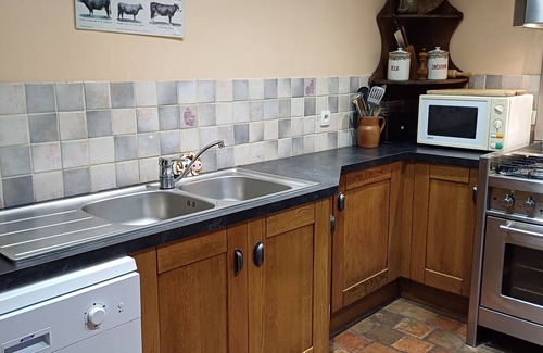 old 18th century farmhouse. independent, ground floor: living room (double sofa bed), tv (DVD player), kitchen (microwave, fridge, dishwasher, semi-professional 5-burner piono), opening without door to living room. 1 bedroom (1 bed 2 pers. 180 separable), wc, utility room: central gas heating, washing machine. upstairs: lounge area, 2 single beds 90x180, and en suite 1 bedroom (1 bed 2 pers 180 cm), teak parquet bathroom (spacious bathtub with seat) wc in the attic extension. baby cot. garden 1500m. carport. games for children. porticos. Ping pong table. vé en tomettes, beamed ceiling, stone fireplace, regional furniture, Norman water tables for barbecue, meals ..