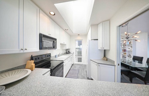 Our house is beachfront in Carlsbad village with beautiful views of the waves from the large balcony on the top floor. Spacious open style living area with modern kitchen, dining room, family room, and 2 large Master bedrooms with bathrooms. A third "add-on" bedroom is accessed through the upstairs Master bedroom with its own doors for privacy and its own windows for natural light. Two super comfy King size beds and one trundle bed with two twin mattresses. Plus a Queen sleeper sofa. Work area (desk and chair) in large Master bedroom with lots of natural light. 5-burner BBQ in our private backyard. The house is only a few minutes walk (a few blocks) to the adorable Carlsbad Village. We have 4 adult bikes, 1 child size bike, plus boogie boards, chairs, umbrella, and toys - everything you need for a fun day at the beach. We have a 2-car garage (doesn’t fit Suburbans, but we have space in the driveway for a large car). Bathrooms are showers (no tubs) and were remodeled in Jan. 2025. Fully stocked with towels and bath products. Kitchen is clean and fully stocked with all kitchen necessities provided for your cooking ease. Three 55-inch smart flat screen TVs. The private backyard is fully enclosed for extra space to relax, cook on the BBQ, or let kids run around safely. Private front door and garage door entrances ensure social distancing safety. The view of the ocean is priceless! Our house is a great choice for your next vacation and we look forward to hosting you!