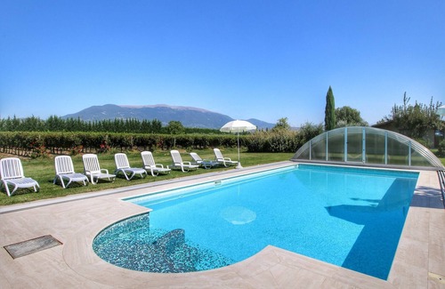 Nestled amid rolling vineyards and olive groves, this serene mansion offers an idyllic escape in the heart of Umbria, a UNESCO World Heritage site. With breathtaking views of Assisi and tranquil surroundings, the property is perfect for families or groups seeking privacy, comfort, and a touch of luxury. Relax in the private swimming pool or unwind in the soothing bubble bath while taking in the peaceful landscape.