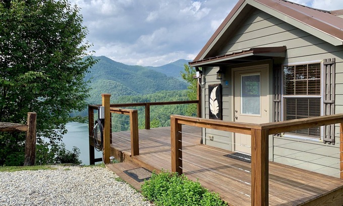 The Tiny Tuck is a reference to the Tuckaseegee River. If you're familiar with our Eagle's Nest 775023 (2/2) and Eagle's Landing 749709 (2/2), then you are aware of the views on this mountain ridge. Well this little gem is a 400 sq ft tiny house. This is where Shannon and I lived while we built the other 2 cabins. Now that we've also built and moved into our dream home, we have the opportunity to share the Tiny Tuck with you! Although the views are very similar to the other 2 homes, on the right side of Fontana Lake, around the bend, it turns into the Tuckaseegee River that flows right through downtown Bryson City. Outside, you'll find a large spacious 470 sq ft deck with outdoor furniture and breathtaking views of the lake and Great Smoky Mountains National Park. There's also a charcoal grill and fire pit with firewood that can be purchased on the property. The outdoor space is perfect for kicking back, star gazing, and roasting marshmallows. On a clear night, you can see the Milky Way! Inside, you'll walk into a small great room with cathedral ceilings, a full chef's kitchen, and all the comforts of home. There's a 12x18 sq ft loft, a full bathroom with tub, and a queen size bedroom. Best of all, there are breathtaking views from every window.