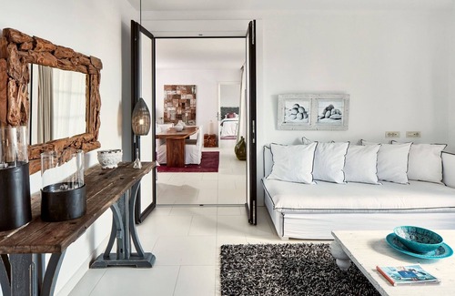 Villa Elegant provides a soothing interpretation of simple and luxurious life on the Greek Islands. Featuring white washed wooden beamed ceilings, and luxurious furnishings, it is comfortable and intimate in feel. Romantic Myconian views from your private balcony add to a distinct sense of romance.
