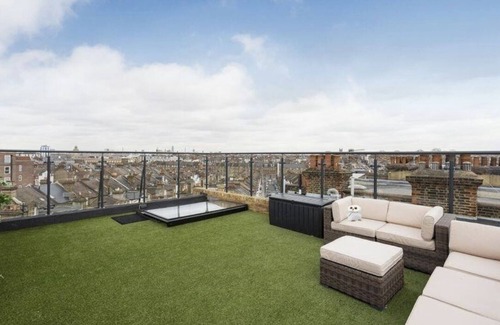 Lovely 1 bed flat in Clapham junction with a unique sliding roof door to the private terrace .