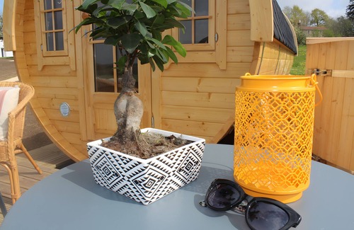 The room/barrel (or cask) can accommodate 2 people and is simply decorated. A small lounge area with a folding wooden table and bench allows you to relax. You have direct access from the terrace to your private Finnish bath (on request 24 hours in advance and available for an extra fee). Your private sanitary cabin is located right next to your accommodation.