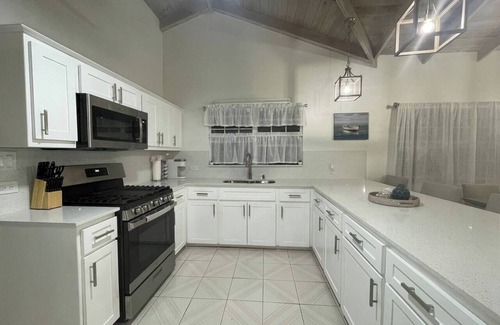 The kitchen and dining are open concept. The dining room is a wonderful space to eat meals prepared in the fully functional, spacious kitchen that features stainless steel appliances and quartz countertop. There is also a Keurig Coffeemaker with an assortment of K-Cups and an electric kettle with a selection of teas for the tea lovers. The layout is perfect for your party to sit on the barstools around the island. This island can also double as a work area.