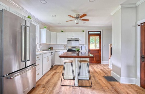 Upstairs you'll find three comfortable bedrooms, decorated with a cozy farmhouse style. Two of our bedrooms offer queen-sized beds, while the other room offers a twin-sized trundle bed. The house also has two bathrooms, making it perfect for families or groups.