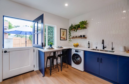 The modern washer and dryer are integrated into the kitchen area, blending seamlessly with the overall design.